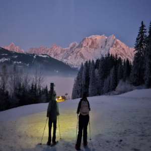 Head into the mountains as the day fades and the sky turns gold. A magical snowshoe walk with unforgettable views as the sun sets over the Alps.